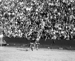 The North Side Steers are facing off against the Highland Park Scots (light jerseys) in the high school football quarterfinals. The game is being played Saturday in Dallas, Texas. Early in game Highland Park completed their first pass, in six attempts, for a touchdown. The quick-toss from Scots' quarterback Fred Benners was caught by end Bob Draper. The Steers' star player Yale Lary (56) is giving chase, but failed to prevent the fourteen-yard touchdown. Highland Park went on to win the game 19-7.