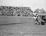 The North Side Steers are facing off against the Highland Park Scots (light jerseys) in the high school football quarterfinals. The game is being played Saturday in Dallas, Texas. Highland Park back, Bobby Maxwell is shown carrying the ball. He drove fourteen-yards for the Scots' second touchdown of the game. The Steers attempting to make the stop are Bob Easly (67) and Bill Bumgarner (63). The Scots went on to win the game 19-7, advancing to the State Finals.