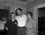 Tom Ryan and his mother, Mrs. P. J. Ryan, right, and Mrs. Emily Beeson, of London, England, left. Ryan has his arms around his mother and Mrs. Beeson. Both women are wearing dresses and Ryan is wearing a short-sleeve collared shirt and trousers.