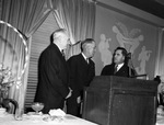 W. L. (Louis) Ingram (center), International Brotherhood of Electrical Workers (I. B. E. W.) Seventh District vice president, Paul M. Geary, of the National Electrical Contractors Association, if Washington, D. C. (left), and Lawson Wimberly, I. B. E. W. Local 716, of Houston, Texas. The men are standing behind a podium, all wearing suits.