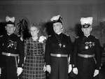 Knights Templar member George S. Adams (second from right) with Mrs. Adams (second from left). Other Knights Templar members are standing on either side of Mr. and Mrs. Adams. The members are wearing their uniforms and Mrs. Adams is wearing a dress.