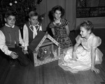Sagamore Hill Elementary School Pageant participants (from left) Lannie Ham, Gene Dimock, Barbara Meek and Barbara Layland. The students are sitting on the floor in front of a Christmas tree and are gathered around a small nativity scene diorama. Barbara Meek is wearing a plaid dress and a ribbon in her hair and Barbara Layland is wearing a white fluffy dress with a ribbon in her hair. Lannie and Gene are wearing long sleeve white shirts with vests.