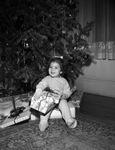 Suzanne Scott, infant daughter of Mr. and Mrs. C. Jack Scott. Small Suzanne is shown sitting at the base of a Christmas tree with a group of presents around her. She holds two small presents in her hands and grins widely. She wears a onesie and a small bow in her hair. The Christmas tree is adorned with decorations such as, Christmas balls and shiny tinsel.