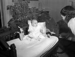 Kenneth Carnrike Kenyon, infant son of Mr. and Mrs. John H. Kenyon. Baby Kenneth is shown sitting in his crib with a pillow and a few of his toys around him. He appears to be looking at his mother, on the right, who is looking back at him. Behind the crib is a Christmas tree adorned in a large amount of shiny tinsel and a few other ornaments.