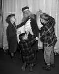 Junior Optimist's Christmas party with Johnny Sullivan acting as Santa and attendees (left to right) Earle Davenporte, standing, Don Donnelly and Jerry Hamilton. Mr. Suillivan is shown playing with the three boys as they surround him. He has an excited expression at his face as Jerry holds up a pillow that he got from "Santa's" stomach. Don is on the floor knelt down with his arms raised while Earle holds another pillow. The boys are wearing coats and trousers. Behind the group is a large curtain.