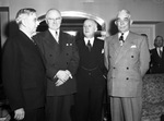 Railroad officials (left to right) Kay Kimbell, Fort Worth, Texas; Donald V. Fraser of Saint Louis, Missouri; R. J. Morfa of Dallas, Texas and Ben E. Keith, Fort Worth, Texas. The four men are shown standing side by side, engaged in a conversation. Fraser, Morfa and Kimbell are looking at each other while Keith smirks at the camera. Each of the men are wearing double-breasted suits and Kimbell and Fraser are also wearing eyeglasses.