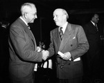 Railroad officials Edward N. Claughton of Miami, Florida (left) and Fort Worth Mayor Roscoe Carnrike. The two men are shown greeting each other and shaking hands. Both are smiling and appear to be in good spirits. Both are wearing suits with patterned neckties. Mr. Claughton is also wearing a pair of eyeglasses while Mr. Carnike holds his pair in his hand. The two are also holding paper and pencil in their hands.