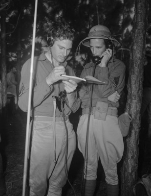 Texas National Guard maneuvers in Louisiana. There's danger overhead- Enemy Warplanes. Such was the warning sent out by Sergeant William Koch, left, of Fort Worth's Headquarter's Company, One Hundred and Forty-fourth Infantry, and Sergeant Howard Christian of the same outfit, over field telephones. Troops actually scurried to cover. Both men can be seen standing next to a telephone hanging on a tree, looking at a booklet.