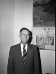 Louis Newman Feagin, clerk of Tarrant County Criminal Distirct Court. Mr. Feagin is shown standing in front of a wall with a calendar hanging on it. He is wearing a pinstripe suit with a striped neck tie and eyeglasses. He is smiling and looking to his left.