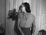 Mrs. Joe Atkins with "Jackie," a talking parakeet, perched on her shoulder. Mrs. Atkins is wearing a striped blouse and a skirt.