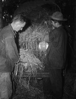 Texas National Guard maneuvers in Louisiana. Camouflage, as in World War I, plays an important part in defense, and one of the best means of disguising a truck from planes is by covering it with grass. Two Jacksboro, Texas citizen soldiers, Privates Albert Chenoweth, left, and James E. Crum, One Hundred Thirty-first Field Artillery, have the job of camouflaging this truck.