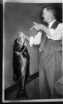 Composite photograph of James Grace holding a large fish. Mr. Grave is shown holding a large fish and point at it with his other hand. He is wearing a suit vest with a long-sleeve shirt underneath and pair of trousers. He appears to be smiling and looking away as he points.