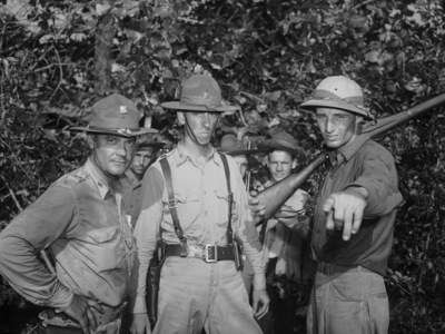 Texas National Guard maneuvers in Louisiana. "Halt, who goes there?" seems to be the command as these three members of the Thirty-sixth Division halt a newspaper correspondent and photographer. Left to right are Lieutenant T. C. Wood and Lieutenant Earl E. Turner, both of Bonham, Texas and Private D. P. Kirk of Hillsboro, Texas. All three men are seen standing with intimidating looks as Private Kirk holds a rifle and points toward the camera.