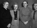 Business and Professional Women's Club Christmas banquet attendees included (from left) Miss Sally Butler, of Indianapolis, Indiana, Mrs. Flossie Kysar, Miss Olive H. Huston, of New York City, New York, and Miss Ruth Townsen. The women are standing against a wall, all wearing blazers and skirts.