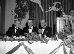 Kiwanis Club Christmas party attendees (from left) Judge Frank P. Culver Junior, Supreme Court of Texas Judge Few Brewster and Harry W. Phillips. The men are sitting at a dining table, all wearing tuxedos. At the far right a man is standing at a podium.