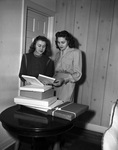 Students at Gulf Park College Lillis White (left) and Agnes Butz standing beside a table on which there are several boxes. They are inspecting one of the packages. Both women are wearing long-sleeve dresses. Lillis and Agnes are childhood friends and college roommates.