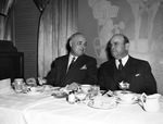 Attending a banquet in his honor is George Scaling (right), retiring cattle buyer for Armour and Company, with A. A. Lund. They are sitting at a dining table, both wearing suits.