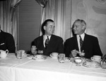 Anthony Alic (left) and Louis Fiquet, of Kansas City, Missouri, attending a banquet in honor of George Scaling, retiring cattle buyer for Armour and Company. They are sitting at a dining table, both wearing suits.