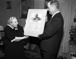 Mrs. Erica Wollner receiving a memorial honoring her late husband, Carl Wollner, from C. W. Wofford. The memorial plaque features a portrait of Mr. Wollner. Mrs. Wollner is wearing a dress and Mr. Wofford is wearing a suit. Mr. Wollner was founder of the Fort Worth Sales Executives Club and Mr. Wofford is the current club president. They are pictured at the Wollner home in Fort Worth, Texas.