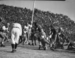 The Texas State high school semifinal game is being played Saturday afternoon in Odessa, Texas. Competing for a berth into the finals are the Highland Park Scots and the Odessa Bronchos (dark jerseys). Early in the contest, the Bronchos back Harvey "Pug" Gabrel (20) is shown plunging up the middle toward the end zone. He was stopped just shy at the one-yard line by Scot defender Dick Brown (36). Also pictured for the Scots are Billy Irish (64) and George Maddox (66). Blocking for the Bronchos are Billy Moorman (41), Gordon Headley (14), and Byron Townsend (27). On the next play, Gabrel pushed the ball over the goal line for Odessa's first touchdown. The Odessa Bronchos went on to win the game 31-13 and win the state title.