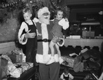 First National Bank Christmas tree at the Lena Pope Home provides a backdrop for Santa Claus, played by Paul Hamilton, holding Carl T. Wasser and Nedra Miller.