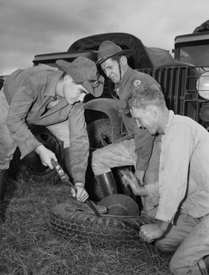 National Guardsmen; Changing a Tire; Tires; Military Vehicles; Morrow, Jack (Pvt.); Newman, T. M. (Sgt.); Powers, John (Pvt.); National Guard of Texas; National Guard Maneuvers; Louisiana Maneuvers; First battalion; Headquarters Battery; One Hundred and Thirty-first Field Artillery