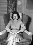 Mrs. William Steward. Mrs. Steward is shown sitting in an armchair decorated with a lace doily on the arms and back of it. Mrs. Steward is grinning widely at the camera while her hands are folded in her lap. She is wearing a belted, long-sleeve dress.