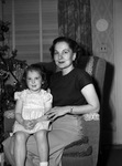Mrs. A. G. Russell and daughter, Suzanne of Albuquerque, New Mexico. The two are shown seated in an armchair next to a decorated Christmas tree. Small Suzanne sits on her mother's lap while the two smile for the camera. Mrs. Russell is wearing a dark, short-sleeve blouse and skirt while Suzanne wears a small dotted dress. Behind them is a window with curtains pulled to the side. The duo are visiting Mrs. Russell's mother, Mrs. Nelle Smith.