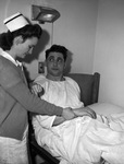 Harry Ornest, a United States Hockey League referee, is in the hospital. His nurse is Mrs. Ralph Eckert. Mr. Ornest is shown sitting up in a hospital bed while Nurse Eckert checks for his pulse. Ornest is wearing a hospital robe and is covered in the hospital blanket while Nurse Eckert is wearing a nurse's hat and a cardigan. Above Ornest's bed is a small light. Ornest was kept in bed at the hospital for two nights after being hit on the head by an irate fan at a previous game.