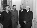 Boy Scouts of America executive board members (from left) R. E. Cox, L. B. Wilson, of Weatherford, Texas, William Fleming and A. L. Shuman receiving the news that a new troop camp at Worth Ranch would be created in honor of Parker County Scouts who served in World War II. All four men are wearing suits and Cox and Shuman are wearing glasses. The men are gathered in the corner of a room, near a window.