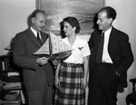 Reverend Bert Helm, pastor of Saint John's Evangelical Church, left, examining a native boat as he talks with his friends, Reverend and Mrs. Pierre Benignus, with whom he worked while island commander of chaplains in New Caledonia during World War II. Reverend Benignus is a French missionary. Rev. Helm appears to be wearing a brown suit, white collared shirt, and a tie. Mrs. Benignus is wearing a plaid skirt with a belt, a short sleeve white collared shirt with a handkerchief on her left pocket and Rev. Benignus is wearing a black suit with a white collared shirt and a tie. There is a sea painting hanging in the wall behind them and a bookshelf to the left of Rev. Helm.