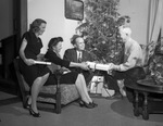 Mr. and Mrs. Don M. Vestal Senior and children, Donald M. Vestal Junior and Miss Mary Helen Vestal. Mr. Vestal is shown knelt down and distributing gifts under the tree to his wife, seated in the chair and his daughter and son, who are on either side of the chair. Miss Vestal was recently discharged from the Waves as a pharmacist mate first class and Mr. Vestal Junior is a major in the army with five years service. The women are wearing dark, short-sleeve dresses and Vestal Junior is wearing a suit. On the other side of the men stands the Christmas tree decorated with tinsel and ornaments. Under the tree are other gifts.