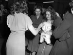 Star-Telegram Christmas party. Shown is a small group of women gathered around and looking on at one woman holding a stuffed animal. Another unnamed woman stands in front of her and appears to be holding a small leash and paper. The women are wearing various short-sleeve dresses.
