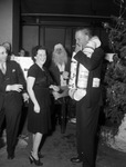 Star-Telegram Christmas party. Shown is a woman standing in front of an unnamed man that is wearing a large necklace made up of tissue rolls. Both are smiling and laughing; the woman is looking at the camera while the man looks at her and smokes a cigar. Behind the duo, a few other people including a Santa Claus are looking on and laughing as well. A Christmas tree can also be seen behind the tissue clad man.