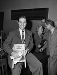 Star-Telegram Christmas party. Shown is a man sitting on the edge of a desk, smiling widely and holding onto a small washboard. The man is wearing a striped suit with a diagonally striped tie. The washboard he is holding reads, "Home Aide". Behind him is a small group of people, both men and women, engaged in conversation.