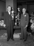 Star-Telegram Christmas party. Shown are Amon G. Carter and Bert N. Honea standing beside each other, both carrying large trophies in their hands. The two men are both wearing suits, with one wearing a bow tie and the other wearing a regular tie. Behind them is a table filled with Christmas presents and other trophies. On the ground behind their feet is a large sheet of wrapping paper splayed out.