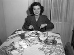 English citizen Miss Grace Jackson to marry an American. Miss Jackson is shown sitting at a dinning table with plates of eggs, bacon and toast in front of her. She has her knife and fork to a piece of bacon and appears to be smiling. She also has a couple of beverages on the side and a stick of butter available. Miss Jackson is wearing a dark jacket with large buttons. She traveled from Preston, England to marry her fiance, James C. Followill, a seaman first class. She is currently staying with her future sister-in-law.