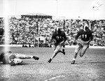 The Texas State high school final game is being played Saturday, December 28, 1946 in Austin, Texas. Competing for the State Championship are the Odessa Bronchos and the Jefferson Mustangs (striped helmets) of San Antonio, Texas. Early in the game, Mustang tailback Kyle Rote (21) is shown scamper to the end zone for a six-yard touchdown. Running interference is Wilbert Heineman (11). The Odessa Bronchos went on to beat the Mustangs, winning the 1946 State Championship 21-14.