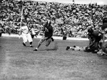 The Texas State high school final game is being played Saturday, December 28, 1946 in Austin, Texas. Competing for the State Championship are the Odessa Bronchos and the Jefferson Mustangs (striped helmets) of San Antonio, Texas. The Mustang tailback Kyle Rote (21) is shown running down the right side of the field to escape pressure up the middle. The Odessa Bronchos went on to beat the Mustangs, winning the 1946 State Championship 21-14.