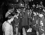 Clay Berry, center, of the Fort Worth Cancer Committee, welcoming the Saint James High School football team. The team will play in a benefit game for the cancer fund. Coach Dell Coe, of Saint James, is standing at the left, beside Berry. The players are gathered around Berry and their coach.