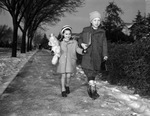 Caradell Murray, 5, and Byron Murray 7, on their way back to school after the holidays. The duo is shown walking down an iced over street. Caradell is holding Bryon's finger as he leads the way. Both are wearing long, thick coats and knit hands on their heads. Byron is also wearing a pair of cowboy boots. Caradell is holding a teddy bear in her right arm while Bryon holds a lunch box and small book in both his hands. Around them, trees line the street. Their parents are Mr. and Mrs. J. K. Murray.