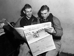 The Odessa Bronchos are Texas High School Football State Champions after beating the Jefferson Mustangs 21-14. Two star Bronchos are reading about their victory in the Fort Worth Star-Telegram. Pictured left to right are Billy Moorman and Bobby Moorman. The twin brothers split time at end on the championship team. Both brothers are dressed in letterman jackets and plaid trousers.
