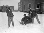 James Lancaster pulls Joe Stripling and David Reuter while Lester Holder and Douglas Allen push the snow sled. Each of the boys are shown smiling and laughing as they try to send off Joe and David on the sled. They are dressed in trousers, coats, hats and earmuffs to protect them against the snow. Lester and Douglas help each other push the sled while James uses a rope to pull the sled along. Behind them, a couple of houses can be seen with bushes lining the walls. The ground is covered in a large amount of snow.