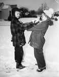 Janelle Hightower, 7, and Dick Olmstead, 8, playing in snow. Dick is shown rubbing a handful of snow into Janelle's face as she tries to push him away with snow in her hands. Both are laughing and smiling and Janelle describes the fight as "fun". Both are dressed in winter coats and hats with snow boots. Behind them, more of the snow can be seen, as well as a house. Janelle is the daughter of Mr. and Mrs Cato Hightower and Dick is the son of Mr. and Mrs. M. B. Olmstead.