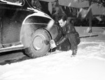 C. H. Johnson putting snow chains on his car. Mr. Johnson is shown knelt down by his car attaching the chains around the wheel of his car. He is wearing a jacket, a pair of trousers and cowboy boots. Behind him a couple of houses can be seen, as well as the ground covered in snow. Mr. Johnson appears focused.