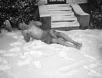 R. D. Seago bathing in snow. Mr. Seago is shown laying out on the snow wearing only a pair of shorts. He appears to be rubbing some of the snow onto his chest and his back, as if he was bathing. Behind him are the front steps of a house, that are also covered in snow. Mr. Seago is smiling slightly.