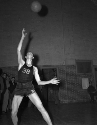 Edgar West is one of the stars of the Polytechnic High School basketball team. He has helped push the Parrots to six straight victories, including a 33-8 win over Arlington Heights. West, number 38, is catching a high pass from a teammate in the gymnasium. A line of students are behind him, watching the action.