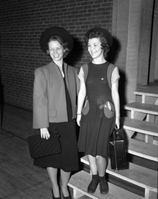 Recreation Department. Circus. Ida May Heffington, left, seen standing next to another young lady, both wearing hats, dresses, and holding purses.