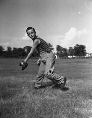 Amateur All-Stars softball pitcher Orien Browning of the Riverside team, is seen standing on a field with a baseball glove in hand a he throws the ball.