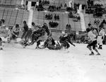 The Fort Worth Cancer Society's Charity Bowl grid classic is being held at Farrington Field on New Years Eve. The high school teams competing in the Bowl are the Istrouma Indians, of Baton Rouge, Louisiana and St. James (dark jerseys) of Port Arthur, Texas. In the first quarter of the game, St. James' fullback Vincent Salvagio is shown running the ball. Making the tackle is Istrouma's J. B. Ouber after evading the block of Harvey Merill. Trailing the play is Pat Windham (44). Kirk Courtney (39) is warding off St. James' Richard Gardemal. Football fans are show sitting in the stands, braving the cold weather and heavy snow fall.